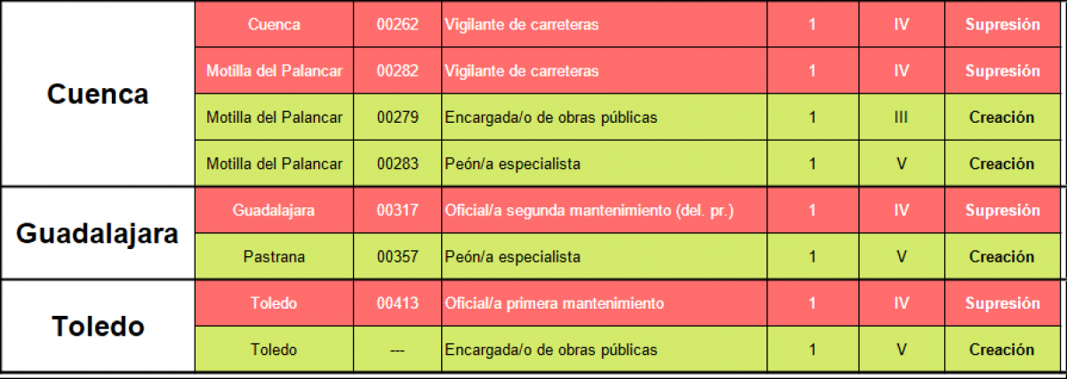 Durante la reunión se trataron varias modificaciones de la Relación de Puestos de Trabajo (RPT) propuestas por la Dirección General de Carreteras (DGC) que afectan Cuenca, Guadalajara y Toledo que implican la supresión de cuatro plazas y la creación de otras cuatro y sin con apenas un incremento de masa salarial de 3.000 euros.